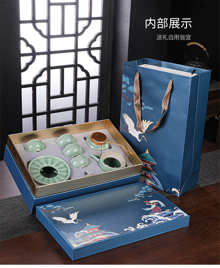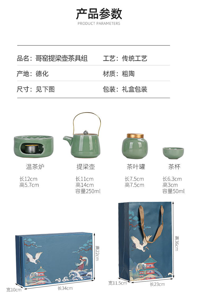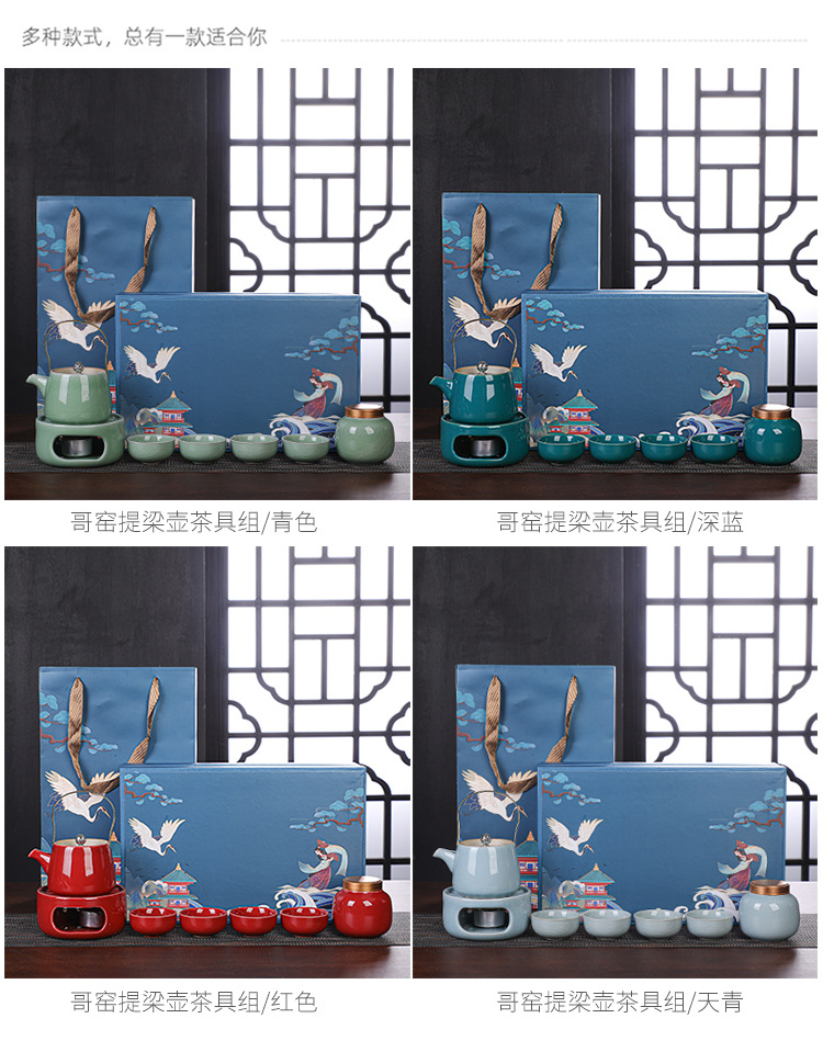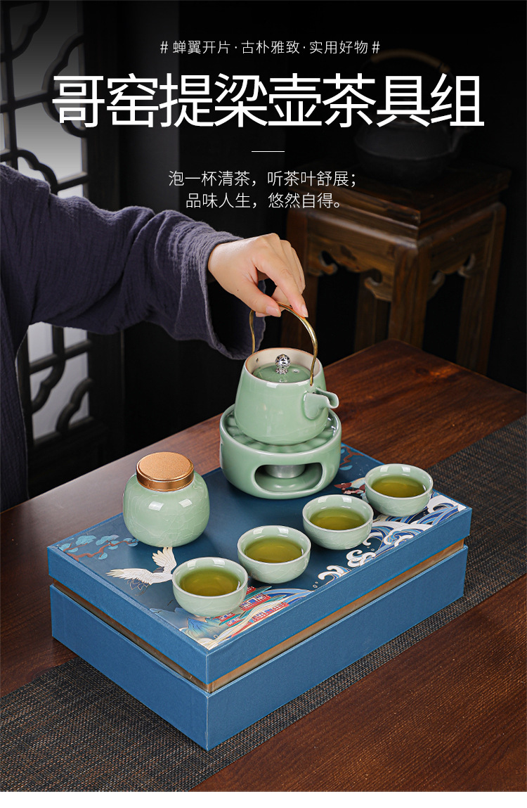 创意国潮哥窑提梁壶茶具套装 煮茶器茶壶茶杯一壶四杯茶叶罐礼盒 送客户礼物送什么好